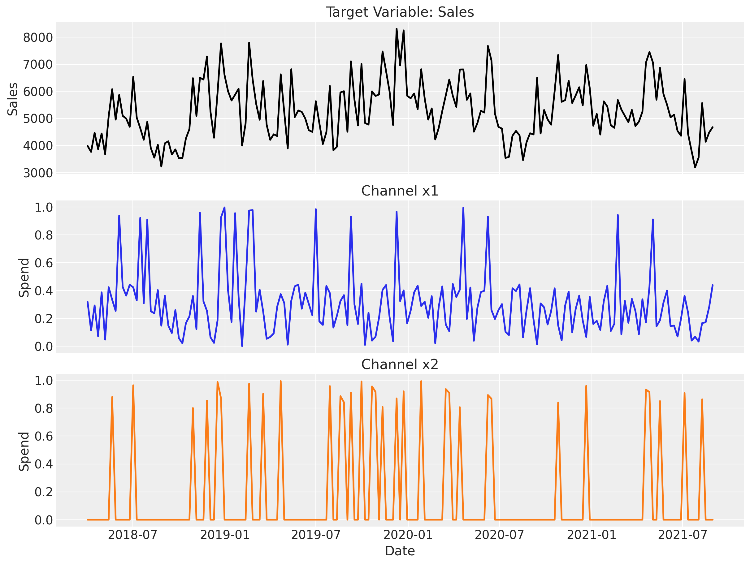 We’ll use a synthetic dataset that simulates weekly sales data along with spend on two marketing channels (x1 and x2), plus some control variables for special events.