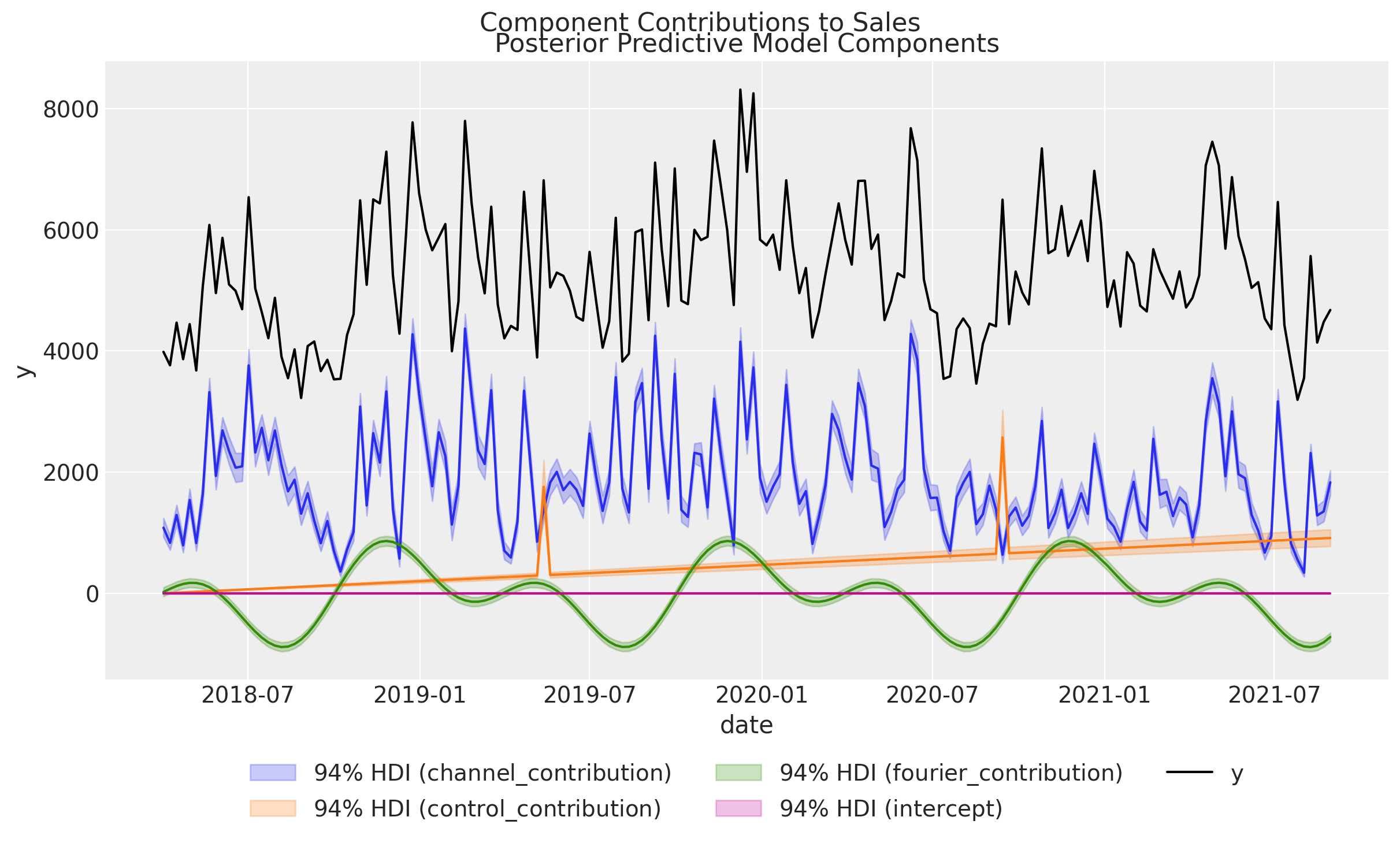 We see that we have captured the linear trend, events contributions and the seasonalities in the data. The remaining variation is due to the media channels, which is exactly what we want to understand.